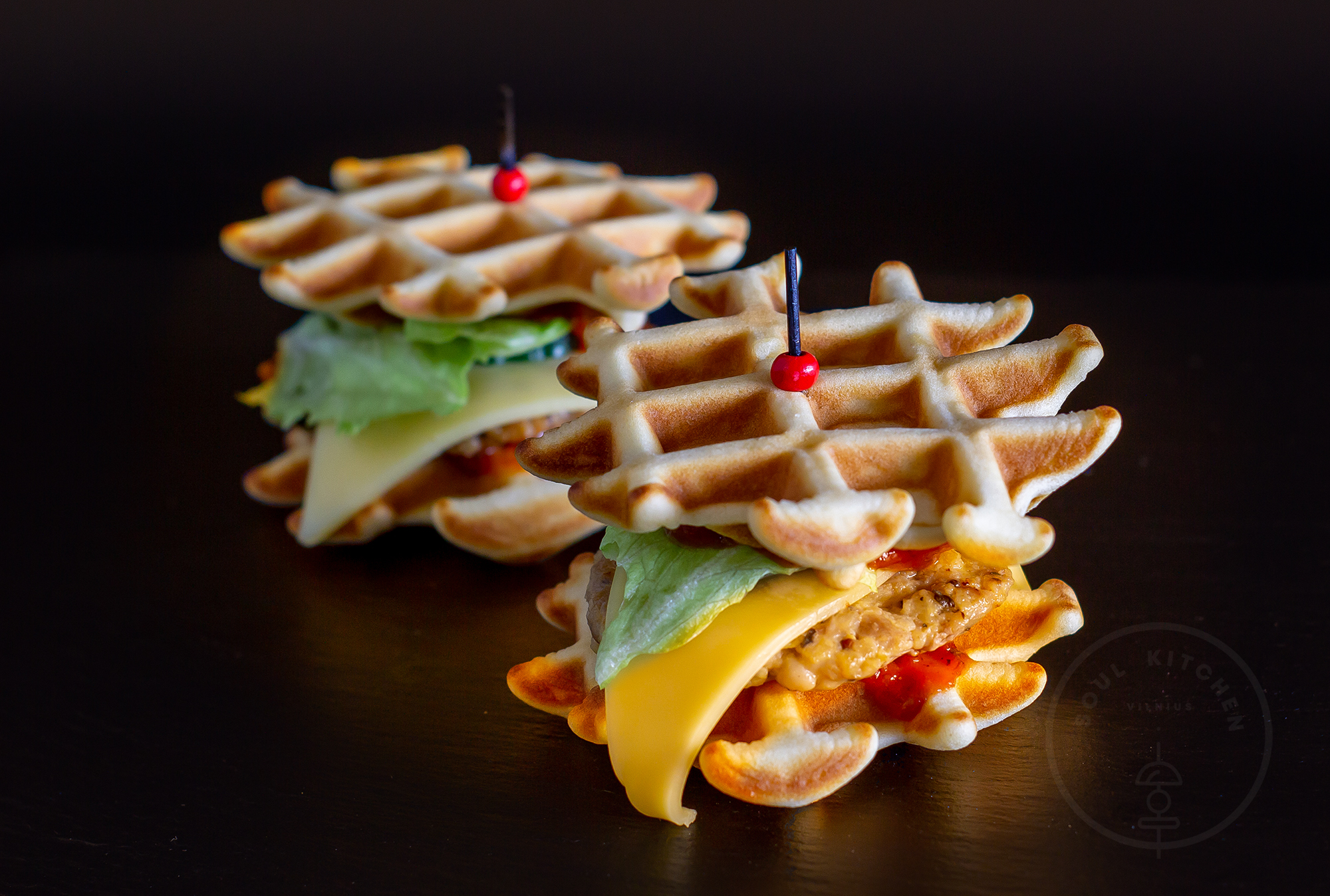 Vafliniai mini burgeriukai galimi su: -jautienos maltinuku, sūriu, marinuotu agurkėliu, šviežiu pomidoru; -vištienos maltinuku, sūriu, gūžine salota iceberg ir šviežiu agurku;